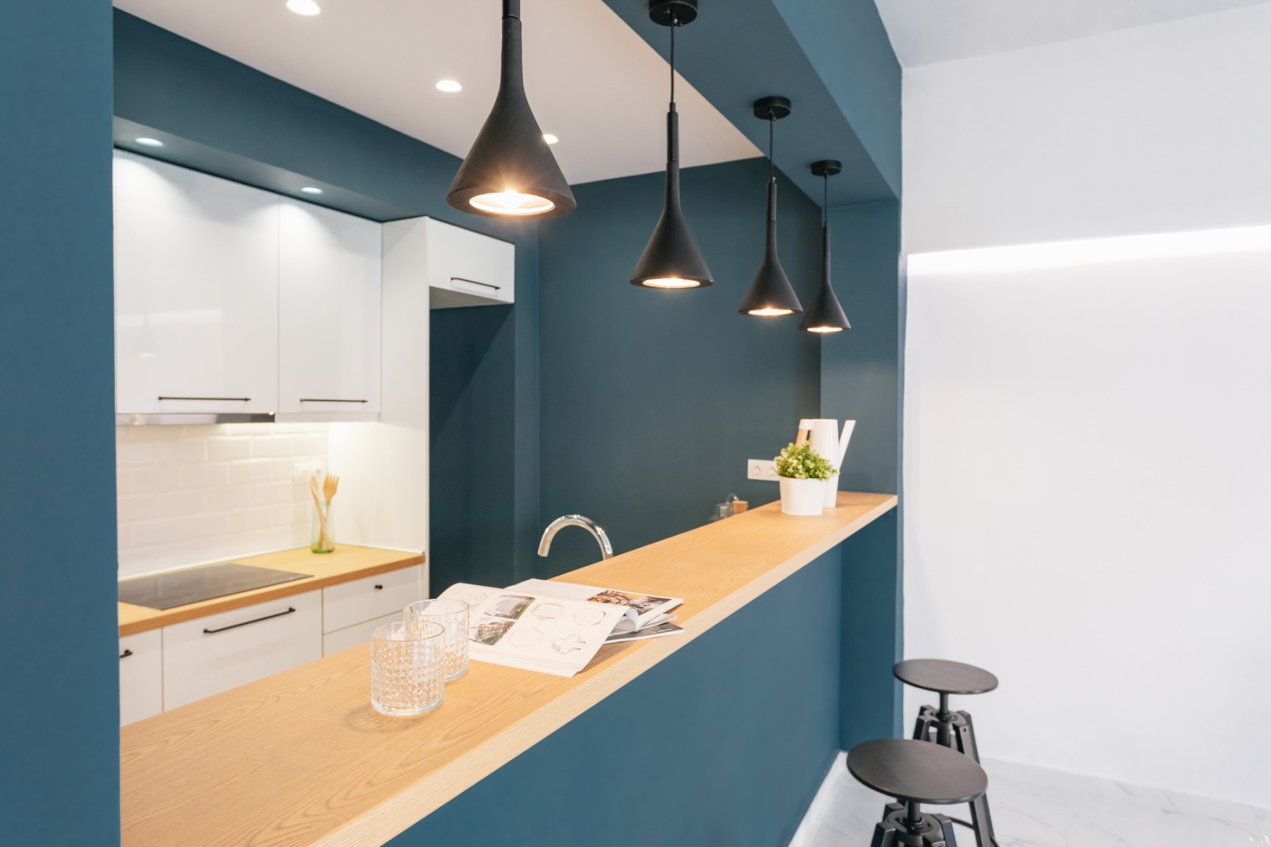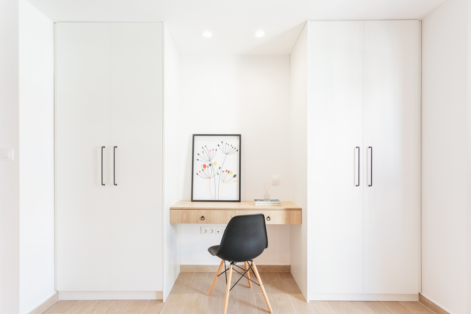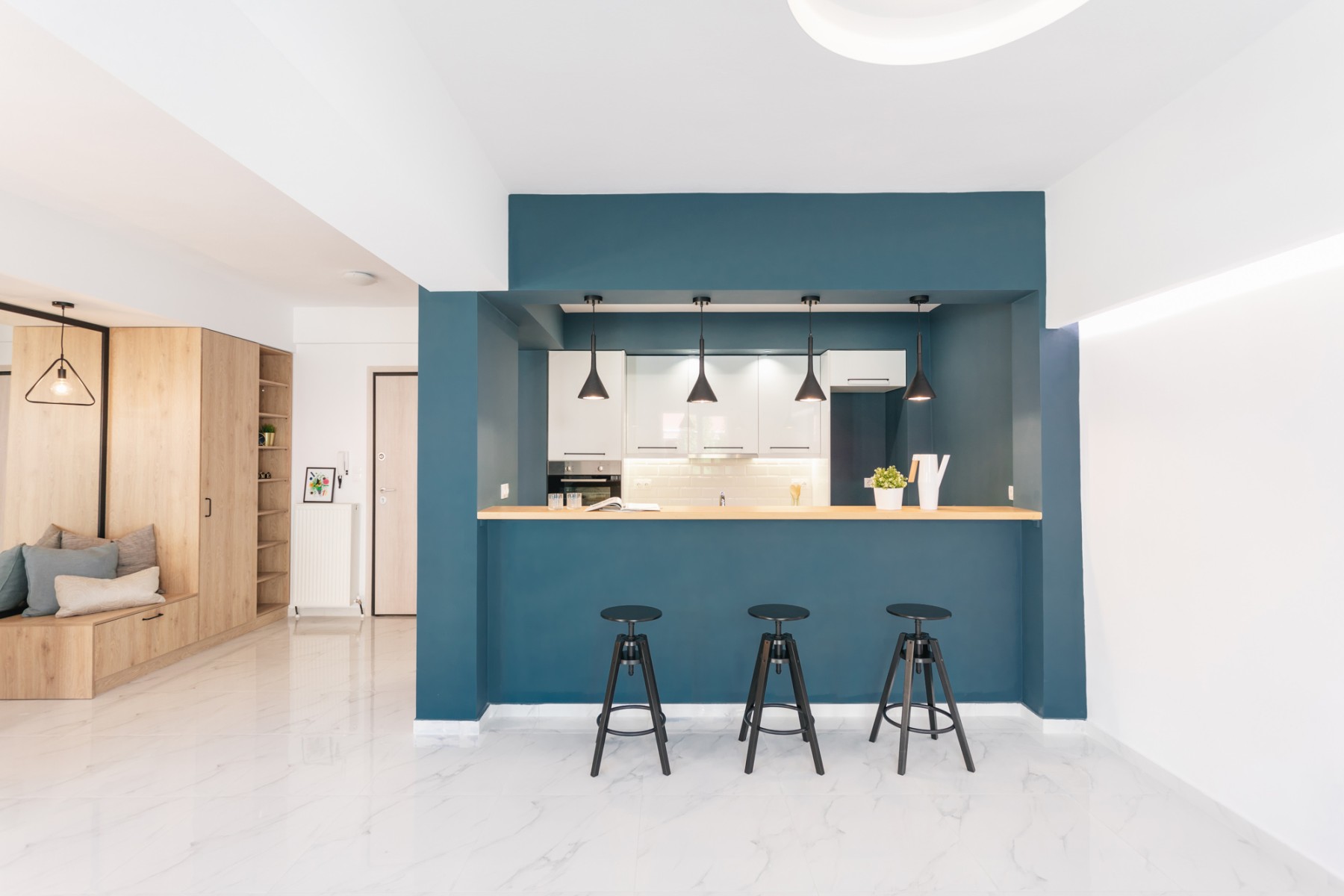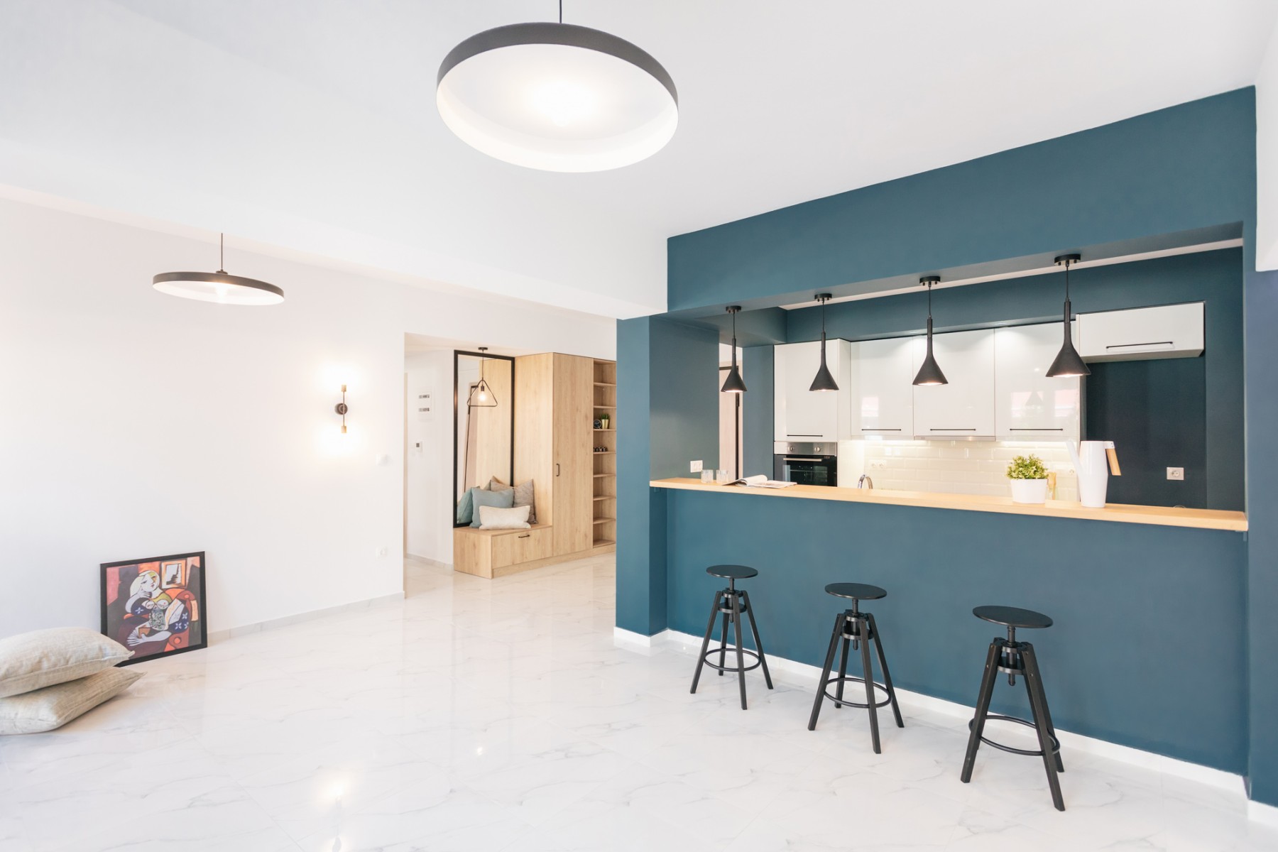 Το ανακαινισμένο διαμέρισμα είναι ευρύχωρο και πολύ φωτεινό. Τα custom made έπιπλα συνδυάζονται αρμονικά με τα υλικά με υφή ξύλου και μαρμάρου, καθώς και τις μεταλλικές λεπτομέρειες, ενώ η επιλογή των γεωμετρικών φωτιστικών βιομηχανικού χαρακτήρα ολοκληρώνει αισθητικά μια πρόταση πιο σύγχρονης κατοίκησης. Σε όλους τους χώρους κατασκευάστηκαν νέες ηλεκτρολογικές, υδραυλικές εγκαταστάσεις ενώ στα υπνοδωμάτια δημιουργήθηκαν νέοι αποθηκευτικοί χώροι, εξυπηρετώντας τις ανάγκες λειτουργικότητας του διαμερίσματος.